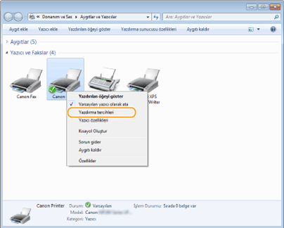 Bu makinenin yazıcı sürücüsü simgesini sağ tıklatın ve [Yazdırma tercihleri] öğesini tıklatın.