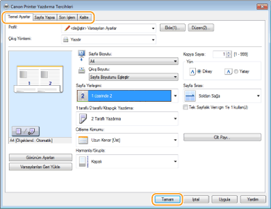 Her bir ekranda yazdırma ayarlarını gerektiği gibi belirtmek için, [Temel Ayarlar], [Sayfa Yapısı], [Son İşlem] veya [Kalite] sekmelerini tıklatın.
