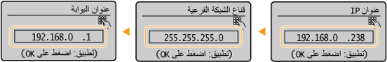 <قناع الشبكة الفرعية> <عنوان البوابة>.أدخل كل إعداد باستخدام المفاتيح الرقمية واضغط على