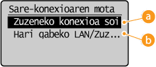 Konexio zuzeneko modua automatikoki ixteaHalaber, makina ezar dezakezu konexio zuzeneko modua automatikoki itxi dezan makina konexio zuzeneneko moduan sartu ondoren denbora tarte zehatz bat igaro denean. <Hari gabeko LAN/Zuz. kon. (aldak. aut.)> zehazten bada konexio metodo gisa konexio zuzeneko moduan, makina hari gabeko LAN bati automatikoki konektatuko da konexio zuzeneko modutik irten ondoren.