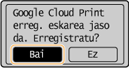 Halaber, makina gailu mugikor batetik edo Google Chrome-etik* erregistratzeko aukera duzu. Makinaren pantailan hurrengo jakinarazpen pantaila bistaratuko da erregistroa amaitu baino lehen. Hautatu <Bai> erregistroa amaitzeko.