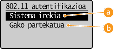 ![]() <Sistema irekia> hautatzean Hari gabeko LAN sare bati konektatzean, makinak autentifikazio-errore bat izango du autentifikazio-gako partekatua hari gabeko routerrean ezarrita badago. Hau gertatzen bada, makinak ezarpena automatikoki hona aldatuko du <Gako partekatua> eta berriz saiatuko da konektatzen. |