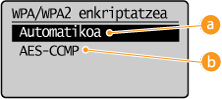 .![]() <Automatikoa>Makina ezartzen du automatikoki AES-CCMP edo TKIP hautatzeko, hari gabeko routerraren ezarpenarekin bat etortzeko.