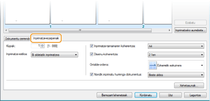 Sakatu [Inprimatze-ezarpenak] bereizlea kopia kopurua edo Alde batetik/Bi aldeetatik inprimatzea bezalako inprimatze-ezarpenak adierazteko balio duen pantaila bat bistaratzeko. Hemen adierazitako ezarpenak inprimatze-lan osoari aplikatuko zaizkio.