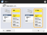 裏表紙を付けるときは<ウラ表紙>を押します。裏表紙にもコピーする場合は、オモテ面、ウラ面、両面のどこにコピーするかを設定できます。