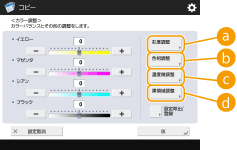 ![]() | イエロー(黄)、マゼンタ(赤系)、シアン(青系)、ブラック(黒)の濃度を個別に調整します。鮮やかさや色合いも指定できるので、色味を細やかに調整することができます。 |