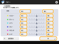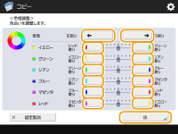 で調整します。各色を個別に設定する場合は、各色の左右にあるボタンで調整します。調整が終わったら<OK>を押します。