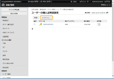 管理者がログインした場合は、登録されているすべてのユーザー署名用の鍵と証明書が表示されます。管理者以外のユーザーがログインした場合は、ユーザー個人の鍵と証明書のみが表示されます。