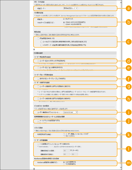 [Webサービスの認証方式 :]で選択した認証方式は、機器情報配信で個人認証を行う場合にも利用されます。機器情報配信時のユーザー認証を設定する