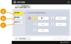 <共通設定> <エラージョブクリア>が<OFF>に設定されている場合は、転送エラー文書は<状況確認/中止>画面の<ジョブ状況>に保存され、ここで設定する処理は行われません。<保存/プリント>選択時にメモリー受信を設定している場合は、保存します。 <保存/プリント>選択時にメモリー受信を設定していない場合は、プリントします。 |