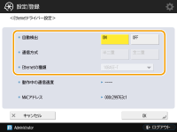 通常は<自動検出>で<ON>を選びます。Ethernetの通信方式や種類が検出されて自動的に設定されます。