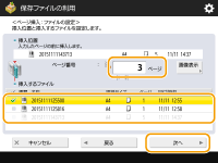 2 | 挿入位置と挿入するファイル指定し、<次へ>を押す ![]() 挿入位置となるページをテンキーで入力します。 |