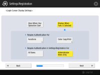 To enhance the security of the machine, use the machine under a system that uses user authentication. ![]() This machine is set to use the user authentication as the login service. For more information, see Configuring the Personal Authentication Management Settings. ![]() Press <On> for <Use User Authentication>, press <On> for the login method to use, and press <Next>. If you do not use user authentication, press <Off> for <Use User Authentication>, press <OK>, and proceed to Step 5. ![]() Specify the following settings if there are no administrators besides the "Administrator" user registered in the machine. ![]() To enhance the security of the machine by disabling the "Administrator" user and registering a new administrator, press <Yes>. In <Register Administrator>, enter <User Name> and <Password>, and press <OK>. Specify <E-Mail Address>, <Department ID>, and <Display Name> as necessary. For more information, see Registering User Information in the Local Device. The "Administrator" user will be disabled the next time you log in. To operate as "Administrator," press <No>. ![]() ![]() Select the timing for displaying the login screen. If you select <Display When Func Is Selected>, press <Functions> and <Color Copy/Print>, select the function to display the login screen for, and press <OK>. Also, select the setting items on the <Settings/Registration> screen to display the login screen for. If you select <Off> for <Keyboard Authentication>, press <OK>. Proceed to step 5. If you select <On> for <Keyboard Authentication>, press <Next>. ![]() ![]() To use authentication via numeric key entry only on the login screen, press <On>, and press <OK>. | |