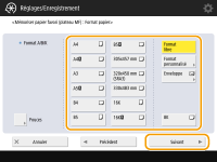 1 | Appuyez sur <Format personnalisé>. ![]() Vous pouvez spécifier la taille de papier <Format libre>, vous n'aurez alors pas besoin d'indiquer le réglage de la taille de papier. Spécifiez <Format libre> lorsque vous chargez du papier de taille inconnue pour faire des photocopies ou lorsque la taille de papier est déjà enregistrée dans le pilote de l'imprimante. |