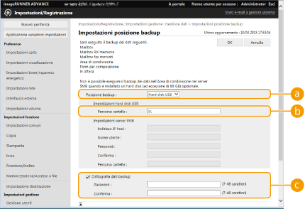 È possibile eseguire il backup dei dati salvati nella macchina in un disco rigido esterno o server SMB. Se si esegue il backup prima dell'aggiornamento del firmware o dell'inizializzazione delle impostazioni, si possono ripristinare i dati qualora sorgessero degli inconvenienti. Per eseguire queste operazioni sono necessari i privilegi di Amministratore.