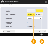 Ethernet è uno standard che definisce metodi di comunicazione all'interno di una rete locale (LAN). Normalmente, il sistema di comunicazione (half-duplex/full-duplex) e il tipo di Ethernet (1000BASE-T/100BASE-TX/10BASE-T) possono essere impostati automaticamente. È possibile impostarli separatamente passando al funzionamento manuale.