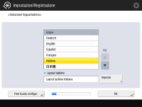 Selezionare la lingua da visualizzare nelle schermate. In base alla lingua, è possibile cambiare la configurazione della tastiera visualizzata per l'inserimento dei caratteri. ![]() ![]() Selezionare la lingua e premere <OK>. Per cambiare la configurazione della tastiera, premere <Imposta>, selezionare la configurazione e premere <OK>. In caso di frequenti cambi di lingua, è comodo visualizzare il pulsante preposto a tale funzione. Modifica della lingua visualizzata | |