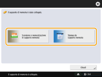 Se <Selez. opzione quando si collegano supporti memoria> è impostato su <On>, le scelte rapide per accedere alle funzioni disponibili vengono visualizzate nel momento che si inseriscono i supporti di memoria. <Selez. opzione quando si collegano supporti memoria>