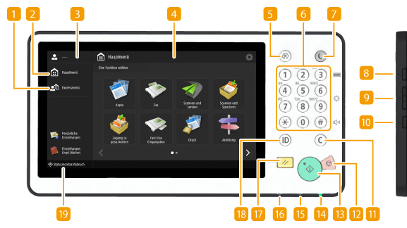 Mit dieser Taste kann der Status beim Drucken und Faxen überprüft oder der Verlauf der Gerätenutzung angezeigt werden. Sie können auch den Status des Geräts überprüfen, wie beispielsweise die verbleibenden Mengen von Papier und Toner oder ob Fehler auftraten.