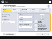 Wenn Sie Dokumente mit vertraulichen Informationen kopieren, können Sie unsichtbaren Text, wie beispielsweise "STRENG GEHEIM" oder "VERTRAULICH" einbetten, um unbefugte Benutzer davor zu warnen, diese zu kopieren. Wenn Sie ein Dokument kopieren, das bereits kopiert wurde, wird der eingebettete Text über die gesamte Seite angezeigt, sodass unbefugte Kopien von Kopien verhindert werden. Systemoptionen