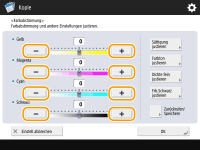 | | Stellen Sie die Dichte von Gelb, Magenta, Cyan und Schwarz separat ein. Sie können auch die Farbintensität und den Ton festlegen, um eine Feineinstellung der Farbe vorzunehmen. |