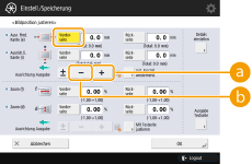 1 | Legen Sie das Vergrößerungs-/Verkleinerungsverhältnis (in %) für <Zoom (f)> und <Zoom (d)> auf dem Bildschirm <Bildposition justieren> fest drücken Sie <OK>.![]() <Zoom (f)>Vergrößert oder verkleinert das Bild entsprechend dem eingegebenen Verhältnis parallel zur Zuführungsrichtung. <Zoom (d)>Vergrößert oder verkleinert das Bild entsprechend dem eingegebenen Verhältnis lotrecht zur Zuführungsrichtung. Falls erforderlich, drucken Sie die Testseite erneut aus, um das Ausmaß der Korrektur zu überprüfen. |