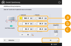 Um den akkumulierten Wert wiederherzustellen, drücken Sie <Init. Einstell. wiederherst.>. Wenn auf dem Ausgabepapier Registrierungsmarkierungen gedruckt werden, entspricht der Druckbereich dem Bereich innerhalb der Registrierungsmarkierungen. |