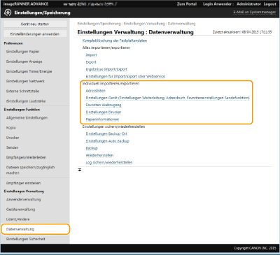 Sie können bestimmte Einstellungen importieren oder exportieren, wie beispielsweise Adresslisten im Adressbuch oder Druckereinstellungen. Administratorrechte sind zur Durchführung dieser Vorgänge erforderlich.