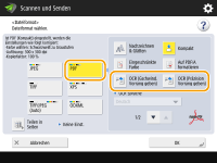 Spracheinstellungen für die Zeichenerkennung | Wenn in <Dateiformat> eine Sprache für OCR ausgewählt ist: Zeichen werden entsprechend der von Ihnen für jedes Dateiformat gewählten Sprache erkannt. Wenn in <Dateiformat> keine Sprache für OCR ausgewählt ist: Zeichen werden entsprechend der Sprache erkannt, die Sie hier ausgewählt haben: <Sprache/Tastatur schalten> (<Sprache/Tastatur schalten>).*1 |