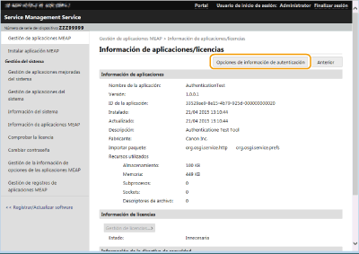 [Información de aplicaciones MEAP] | Muestra una lista de las aplicaciones (excepto las aplicaciones del sistema) instaladas actualmente y ya desinstaladas. |