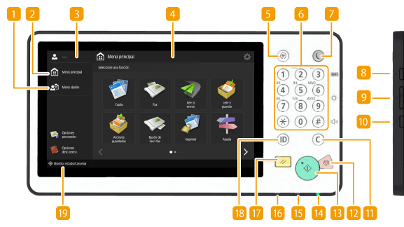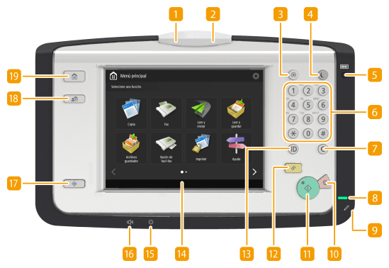 Púlsela para consultar el estado de impresión o fax, o para ver el historial de uso. Así mismo, puede consultar el estado del equipo, como la cantidad restante de papel y tóner, o si se han producido errores.