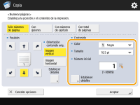 Si establece <Configuración opc. numerar juegos de copias> en <Sí>, la configuración que puede especificar cambia de la siguiente manera. <Configuración opc. numerar juegos de copias>