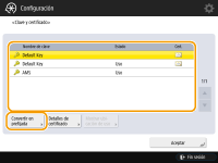 Seleccione la clave y el certificado para utilizar con comunicación cifrada TLS, y pulse <Convertir en prefijada>  <Sí>.