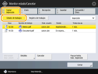 Si pulsa <Detalles> tras seleccionar un documento, puede cancelar la impresión, consultar el estado del trabajo, etc.