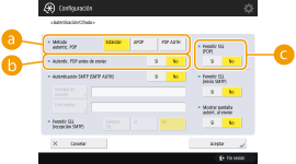 Para enviar directamente documentos escaneados por correo electrónico/I-fax sin pasar por un ordenador, tiene que configurar las opciones de comunicación con un servidor de correo, métodos de autenticación, etc. En general, se utiliza un servidor SMTP para enviar, y un servidor SMTP o POP3 para recibir. Puede establecer codificación y otros parámetros. Para obtener detalles sobre las opciones necesarias, póngase en contacto con el proveedor de servicios de Internet o los administradores de la red.