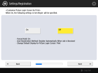 To enhance the security of the machine, use the machine under a system that uses user authentication. ![]() This machine is set to use the user authentication as the login service. For more information, see Configuring the Personal Authentication Management Settings. ![]() Press <On> for <Use User Authentication>, press <On> for the login method to use, and press <Next>. If you do not use user authentication, press <Off> for <Use User Authentication>, press <OK>, and proceed to Step 5. ![]() Specify the following settings if there are no administrators besides the "Administrator" user registered in the machine. ![]() To enhance the security of the machine by disabling the "Administrator" user and registering a new administrator, press <Yes>. In <Register Administrator>, enter <User Name> and <Password>, and press <OK>. Specify <E-Mail Address>, <Department ID>, and <Display Name> as necessary. For more information, see Registering User Information in the Local Device. The "Administrator" user will be disabled the next time you log in. To operate as "Administrator," press <No>. ![]() ![]() Select the timing for displaying the login screen. If you select <Display When Function Is Selected>, press <Functions> and <Color Copy/Print>, select the function to display the login screen for, and press <OK>. Also, select the setting items on the <Settings/Registration> screen to display the login screen for. If you select <Off> for <Picture Login> and <Keyboard Authentication>, press <OK>. Proceed to step 5. If you select <On> for <Picture Login> or <Keyboard Authentication>, press <Next>. ![]() ![]() To use authentication via numeric key entry only on the login screen, press <On>. If you select <Off> for <Picture Login>, press <OK>. Proceed to step 5. If you select <On> for <Picture Login>, press <Next>. ![]() ![]() Press <On> to force PIN entry with Picture Login or <Off> to not force entry, and press <Next>. ![]() ![]() If you use Picture Login and want a setting configuration suitable for printing, press <On>. Forced hold printing is enabled, user registration is set to use print data from a computer, and a login screen suitable for printing by the user is displayed by default. For more information, see Configuring the Forced Hold Printing Settings, <User Registration Method>, and <Change Default Display for Picture Login Screen>. ![]() ![]() Select the number of preset buttons on the Picture Login screen, and press <OK>. | |