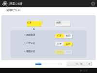 在以下情况下,无法启动“设置向导”。已设置用户认证或部门识别码认证。 已设置部门识别码认证。 已执行卡认证。 |