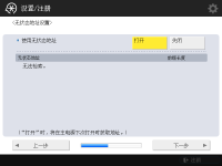 指定网络连接的设置。 ![]() ![]() 为<使用IPv4>或<使用IPv6>按<打开>,并按<下一步>。您还可以同时使用IPv4和IPv6。 如果为<使用IPv4>和<使用IPv6>按<关闭>,并按<确定>,跳过网络设置并继续执行步骤9。 ![]() 如果为<使用IPv4>按<打开>,指定以下设置。 ![]() 要自动获取IP地址,按<DHCP>或<自动IP>,并按<下一步>或<确定>。 要手动设置IP地址,清除<DHCP>或<自动IP>的选择,按<IP地址>、<子网掩码>和<网关地址>输入每个值,并按<下一步>或<确定>。 有关IPV4地址设置的信息,请参阅设置IPv4地址。 ![]() 如果为<使用IPv6>按<打开>,指定以下设置。 ![]() 按<打开>使用无状态地址,或者按<关闭>不使用无状态地址并按<下一步>。 有关IPv6地址的信息,请参阅设置IPv6地址。 ![]() 指定无状态地址后,指定以下设置。 ![]() 按<打开>使用手动地址,或者按<关闭>不使用手动地址并按<下一步>。 要使用手动地址,按<手动地址>、<前缀长度>和<默认路由器地址>输入每个值。 ![]() 指定手动地址后,指定以下设置。 ![]() 按<打开>使用DHCPv6,或者按<关闭>不使用DHCPv6并按<确定>。 | |