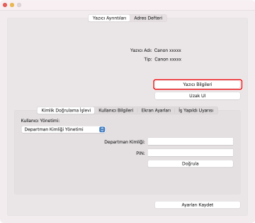 NOT[Yazıcı Bilgileri] sorgu kutusunun üst kısmında görüntülenen sürücü adıyla [Yapılandırma] > [Yazıcıdan Alınan Ad]'da görüntülenen ad eşleşmiyorsa aygıtın işlevlerini kullanamayabilirsiniz. Bu durumda macOS'in [Sistem Ayarları] bölümünden aygıtı silip yeniden kaydedin.