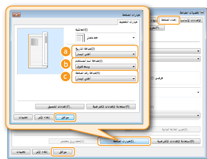 حدد موضع طباعة التاريخ، أو اسم المستخدم أو ورقم الصفحة