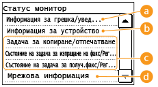 , се извежда екран, чрез който можете да проверите състоянието на документи, които се отпечатват, изпращат или получават, както и състоянието на устройството, като например нивото на тонера или настройките на мрежата (например IP адреса на устройството).