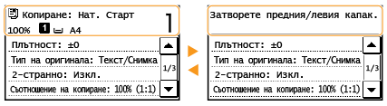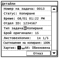 Показва текущото състояние на избрания елемент. Екранът <Статус на зад. за коп./отпеч.> е показан по-долу като пример.