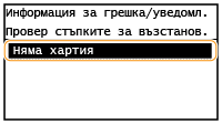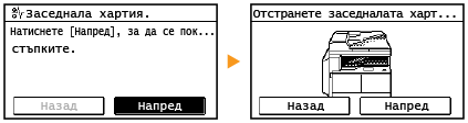 В някои случаи, когато възникне грешка, се извеждат инструкции как да се реагира при тази грешка. Следвайте инструкциите на екрана, за да отстраните проблема. Екранът, който се извежда при засядане на хартия, е показан по-долу (