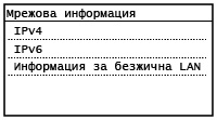 Показва мрежовите настройки, като напр. IP адреса на устройството, и състоянието, като напр. условията за безжична LAN комуникация.