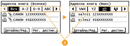 Адресната книга позволява да зададете дестинация, като я изберете от списък със запаметени дестинации или като я търсите по име (за дестинации с имена на получатели).
