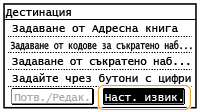 Дестинациите от факс, за който са били зададени няколко дестинации, както и дестинациите в ръчното изпращане, не са налични за тази функция. Изпращане на факс документи до множество дестинации едновременно (Последователно разпращане) Осъществяване на повикване преди изпращане на факс (Ръчно изпращане)