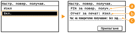 За да съхраните получените документи, за <Настройки за повер. получаване> задайте настройка <Вкл.>. Можете също да зададете допълнителни настройки, като например настройка за сигурност, която изисква парола за достъп до функцията, и интервал от време в денонощието за съхраняване на получените документи в паметта.