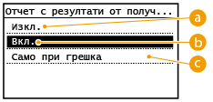 Ако изберете <Вкл.> или <Само при грешка>, част от факс документа може да бъде включена в отчета. Докоснете <Вкл. изпращане на изображение>, за да зададете <Вкл.>.