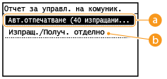 Можете да проверите регистрите с изпратени и получени документи по факс, като отпечатате отчет за управление на комуникациите. Отчетът може да бъде отпечатван автоматично на всеки 40 изпращания или можете да го отпечатате ръчно.