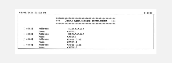 Можете да проверите списъка с дестинации, запаметени в адресната книга, като например <Кодове за съкр. наб.>, <Съкратено набиране> и <Групово набиране>, като отпечатате списък на адресната книга.
